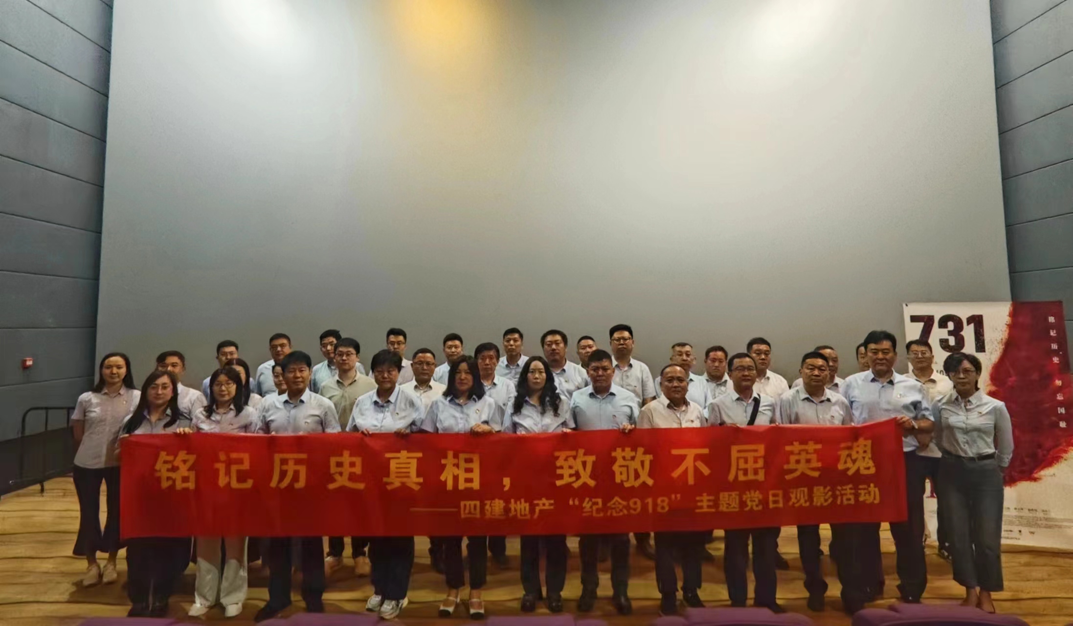 2025年9月18日下午,在“九一八事變”94周年之際,為踐行社會主義核心價值觀、弘揚愛國主義精神,在四建地產副總經理、萬盛物業(yè)總經理李勇的帶領下,四建地產黨支部組織全體黨員、入黨積極分子、青年員工代表,開展了“銘記歷史真相,致敬不屈英魂”主題觀影活動,共同觀看愛國主義教育影片《731》。
